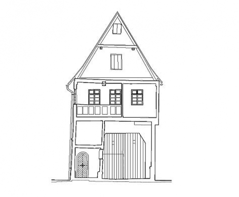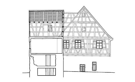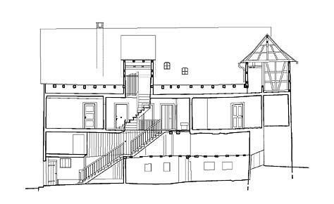 bauaufnahme: schnittansicht mit ehemaligem wehrturm