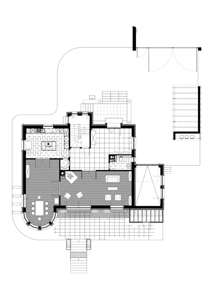 Jahrelang vernachlässigt wurde die freistehende Villa von 1932 zu neuem Leben erweckt. Außerhalb der normalen Bebauung, bot sich mit einem fast 4000 m2 Grundstück auch die Gelegenheit den Garten zu einem zentralen Thema zu machen.